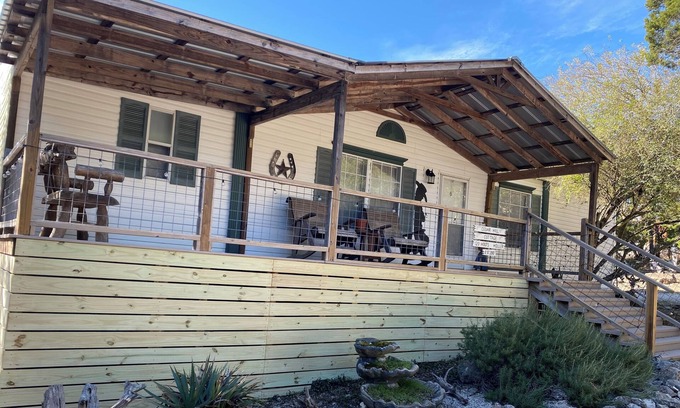 Located on 3 1/2 acres, this charming 3 Bedroom/2 Bath manufactured home sits on a quiet country road just minutes from beautiful downtown Wimberley. Watch the wildlife from both the front and back decks where the deer roam freely. Take a stroll around the property and enjoy the fresh air and nature all around. There are many great restaurants in Wimberley for dining out. If you decide to stay in, our fully equipped kitchen and gas grill on the back deck will help in preparing all your favorite meals. There are 2 tables in the kitchen area to seat everyone at once for dinner and dessert or to play games. The Living room has a wonderful over-sized reclining leather sectional that seats many! Relax with a movie from our extensive library or stream your favorite shows on the Smart TV. Or simply unplug from the world and talk, laugh and make memories with your friends and family.
