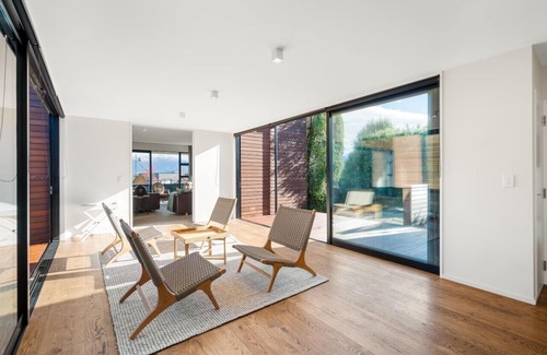 The unique internal courtyard provides privacy and shelter whilst the front balconies look out to the view, over Lake Wanaka and Black Peak.