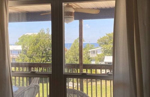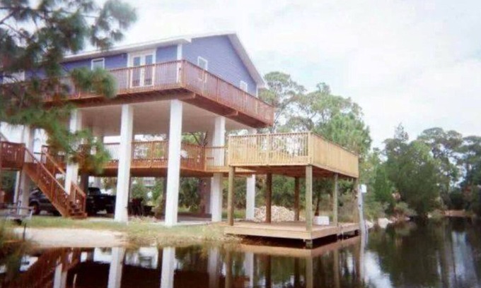 House is on cement pilings and first floor is 22 feet in the air. Mezzanine deck and large private dock. Catch fish and crabs.
