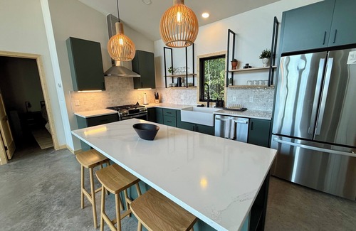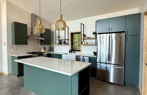 Our large kitchen island serves as the natural gathering spot, equipped with a fully-stocked kitchen that makes meal preparation easy. Whether you're brewing morning coffee while taking in those stunning lake views or preparing hearty après-ski dinners after a day on the mountain, this space brings people together in the most natural way.