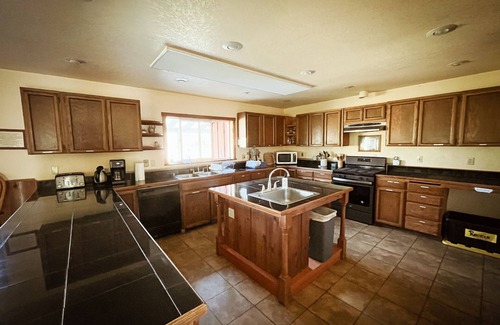 Our Lodge comes equipped with a spacious kitchen, suitable for entertaining large groups, and offers cozy decor, wood accents, vaulted ceilings and rustic charm to spare. Come to gather, explore, share, and celebrate. Appreciate the natural wonders of this historic destination and create experiences that you and your group will fondly remember!