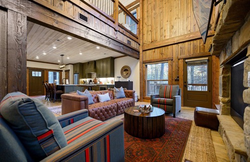 Step into the open-concept living area, where warm wood finishes and modern décor create a welcoming, upscale mountain vibe. The living room flows seamlessly onto a custom-designed patio, where you'll find a stone gas fireplace, large HDTV with surround sound, and cozy seating overlooking the pond’s streaming fountain—a perfect spot for morning coffee or evening cocktails.