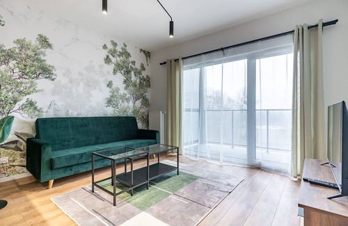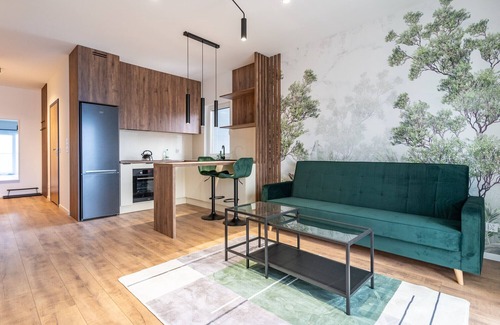 Ceglana Green Studio is a stylishly furnished apartment, featuring a living room with a sofa bed and a kitchenette, a bathroom, and a balcony where guests can relax and enjoy their morning coffee or an evening glass of wine. Guests have various amenities at their disposal, including free Wi-Fi, cable TV, washing machine, iron, hairdryer, dishwasher, oven, refrigerator with a freezer, and kitchen accessories.