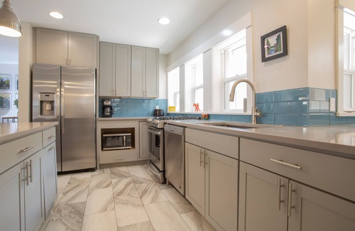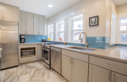 Upstairs, you'll find three cozy bedrooms and plenty of space for everyone to relax and unwind. Also, upstairs are two full bathrooms and an updated kitchen. Downstairs, there's a game room and activity closet for kids of all ages. Also, find a living area, a bedroom with 2 twin beds, an additional queen bed in the common area, and laundry room with washer/dryer. The steps leading to the downstairs area are original to the house and steep! Elderly folks and children may not be best suited for staying downstairs. A baby gate is provided.