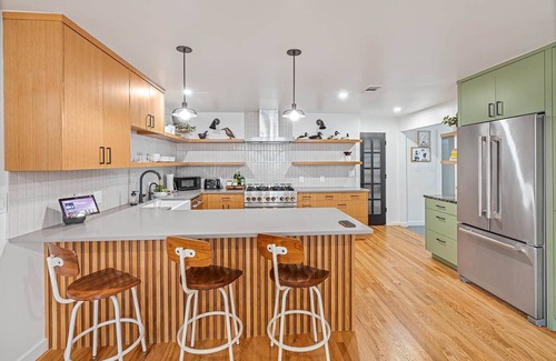 Welcome to your perfect Austin escape—a spacious, family-friendly 3-bedroom, 3-bath split-level retreat designed for relaxation, fun, and togetherness. Nestled on a beautifully rock-landscaped lot with majestic oak trees, this inviting home sets the stage for memorable stays both inside and out. Step into your expansive backyard oasis, the focal point of the property, where a generous deck and elevated patio offer expansive area to relax and chat with a glass of wine. The yard is packed with activities—enjoy games of corn hole and bocce ball, or take batting practice with the net and tee. The enclosed porch, with floor-to-ceiling windows and plenty of seating, is perfect for relaxing with garden views in any weather. Inside, the heart of the home is a welcoming living room with a soaring beamed ceiling and a large, comfy sectional perfect for movie nights, games, or simply unwinding—complete with a smart TV for streaming all your favorites. The modern kitchen features sparkling stainless steel appliances, a spacious gas stove, a breakfast bar for three, and flows seamlessly into a dining area with seating for six, making family meals and entertaining easy.
