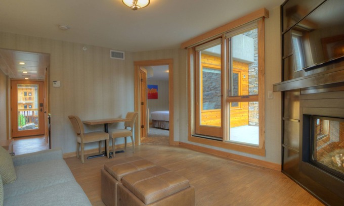 Our newly-built and cozy 494 sq.ft. suite is set against a backdrop of the beautiful Rocky Mountains, and is PERFECTLY located in the heart of the action, a mere 1-minute walk from the lively town centre. Large windows and natural wood furnishings will have you feeling relaxed and rejuvenated in this functional space. You'll love to breathe the fresh air from your private balcony, or to cozy up in front of the gas fireplace on cooler evenings.