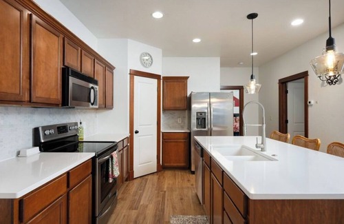 Retreat to the Wild West in this fresh 4 bedroom home! Enjoy a safe neighborhood with parks, trails, and ponds nearby. This spacious setting can sleep up to ten of your friends or family members. It is stocked with everything you need to feel at home including fresh coffee and hotel grade bedding. Enjoy twinkle lights and a traeger on the patio. Use the garage to park, play, or store your gear.