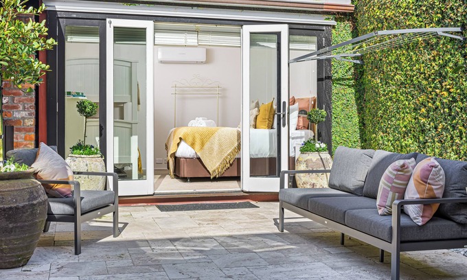 French doors open to a sunny, private courtyard with outdoor dining and BBQ. The third bedroom is located in the detached studio, with a queen bed and king single bunks—ideal for extra guests or a secluded escape.