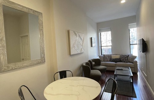 This gem of a floor through unit is perfect for large groups, short or long term stay. It's been renovated and freshly furnished to accomodate guests with all the hotel amenities you can think of, while maintaining the New York charm.