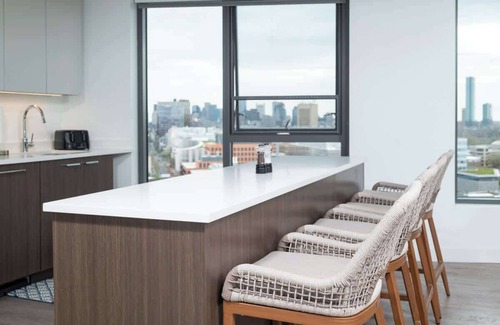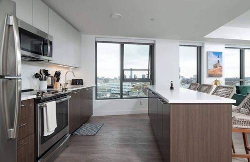 Indulge in luxurious living at your next Cambridge Crossing retreat, the fully equipped kitchen harmonizes with the dining and living area, offering a sensory feast of comfort. Two dreamy bedrooms, one with a king-sized bed and another with two queens both with a private ensuite. Immerse yourself in nearby top attractions while enjoying access to a range of building amenities, from a rooftop BBQ, meeting room & full gym