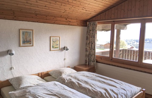 The smaller bedroom with a view of the Flimserstein has two single beds, the larger south bedroom has two single beds and a cabin bed.