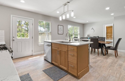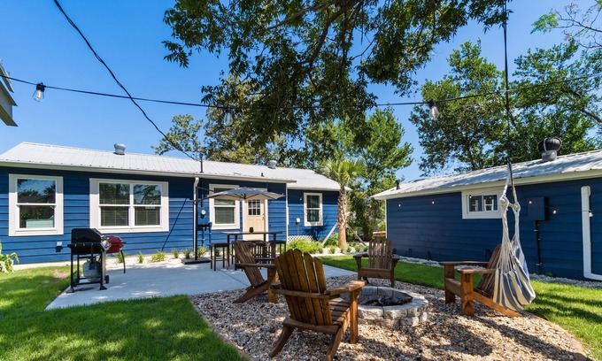 This completely renovated home away from home boasts a front yard under a beautiful magnolia tree and a wonderful backyard shared with the studio apartment. The backyard enjoys a patio, a firepit surrounded by Adirondack chairs, a gas grill for summertime cookouts, a hammock swing, and an equipment shed. This is the perfect spot to spend tranquil evenings barbecuing, roasting marshmallows, and enjoying alfresco meals.