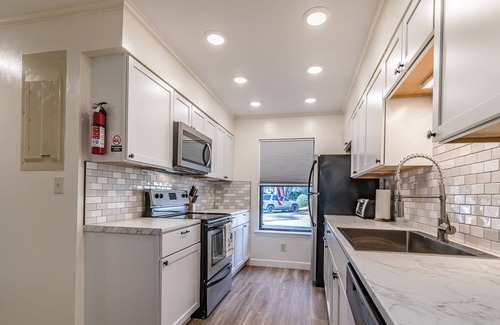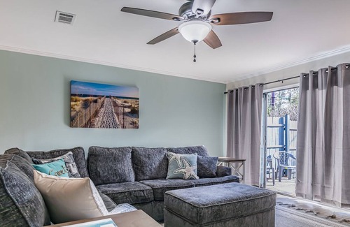 The kitchen, living room and a half bath are located on the main level, while both bedrooms are located upstairs. Both bedrooms have a private bathroom and one King and one Queen size beds. The kitchen is fully equipped so you will feel right at home. Enjoy the cool breeze and dolphins from the Battery Creek around the corner and walking distance from the back porch.