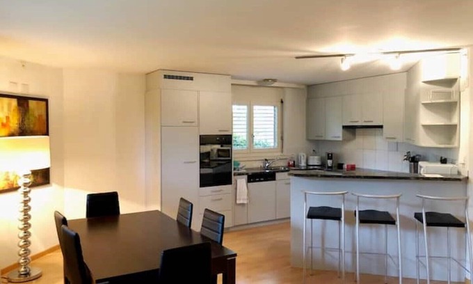 Bright modern furnished apartment in a central location (15 mins by tram to Zurich Main Station). Tram stop located 1 minute's walk. Easy access to airport (15 mins by car). Convenient for both business and leisure visitors to Zurich. Private parking.