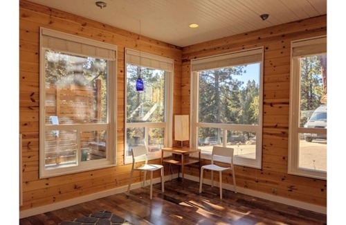 The main area has a huge vaulted ceiling and a full kitchen with stainless appliances and a gas range. The living area has a gas stove, TV with streaming services (no cable), and comfy furniture. There is one dedicated bedroom (Cali. King), and one bathroom (only shower). Additionally, the sunroom has a pull-down queen-sized murphy bed and can easily act as a second bedroom. There's also a great porch where you can relax after a day on the trails or at the river.