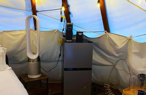 Camping Tipi with Splendid padded Cots. Air Conditioning and Mini-Fridge & Fiber Wi-Fi. On the ground with a wood firepit. Bright Lantern included. Bring your own sleeping bags, bright lanterns, flashlights, and towels provided. Private or communal BBQs, private picnic tables, freshwater swimming ponds, nature trails, and more. Restrooms and hot showers are just steps away—a 2-minute stroll to a local market.