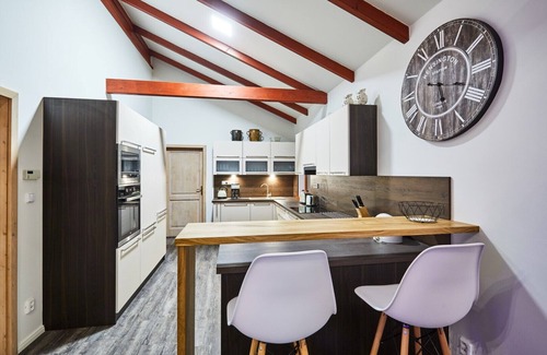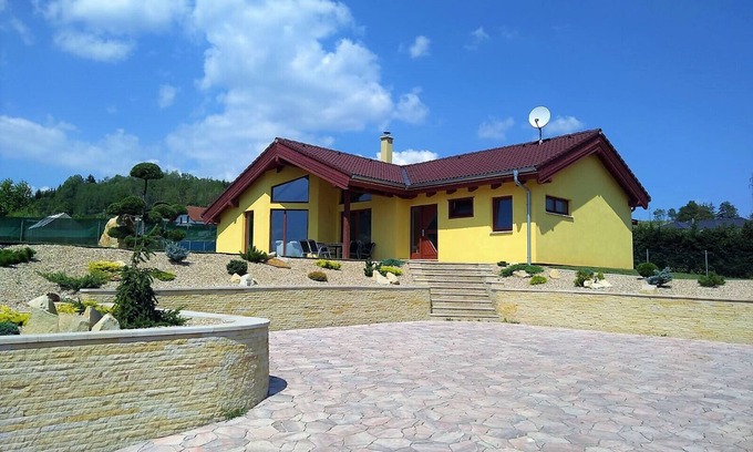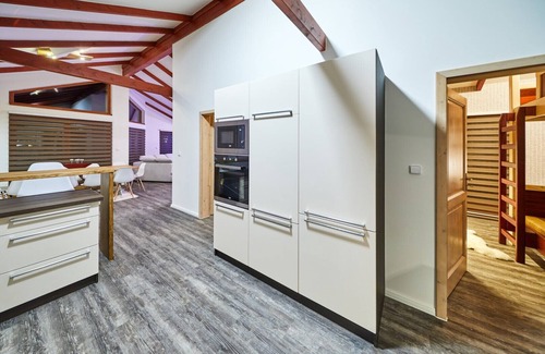 Looking for a holiday home that feels like a gift to yourself? This modern wellness villa is anything but ordinary. Thoughtfully designed and recently built, this chalet is your perfect retreat – whether you're travelling with family or friends.Step inside and you’ll find a bright and stylish living space with large windows, a cosy sitting area with a fireplace, and a dining area where you’ll want to linger long after dinner. The villa sleeps up to 10 guests and features three bedrooms and two comfortable bathrooms. But the real wow-factor? Your own private wellness: a Finnish sauna, a jacuzzi for five people, and a 3 x 7.5 metre saltwater pool – partially covered, so you can swim from May to September, rain or shine.Outside, you'll enjoy a spacious garden with two covered terraces. Plenty of privacy, peace and quiet – plus a stone barbecue, sun loungers and even a trampoline for the kids. Or just grab a book and a glass of wine. Do as much or as little as you like.The location? A peaceful little village near Hostinné, in the foothills of the Giant Mountains. Skiing or cross-country trails are just 11 km away (Mladé Buky), and in summer you’ll find endless opportunities for hiking, biking or golfing. Day trips to Trutnov, the safari park in Dvůr Králové or the baroque gem of Kuks are all within easy reach – and even a quick visit to Poland is well within reach.