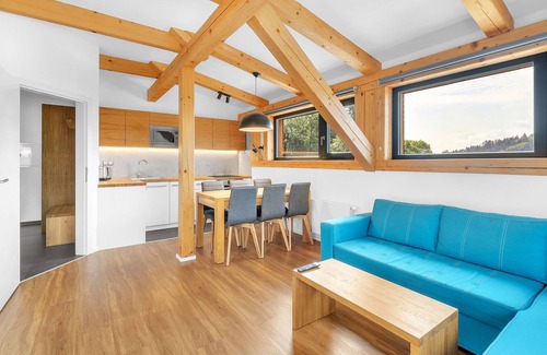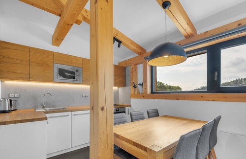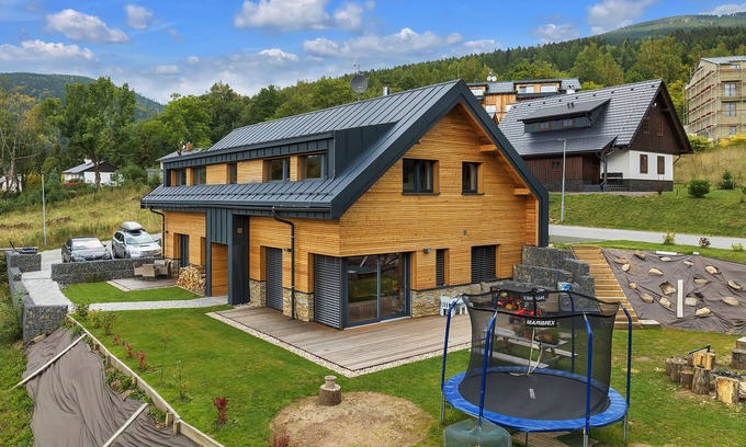 The stunning modern villa is perfect for groups of 10 people. It has an amazing view to the forests and lies in one of Cerny Dul's most popular areas, which means you're never far from all activities! You'll love this spot because there are plenty space inside where everyone can relax while still being able do some fun things on their own if they want too - like enjoying a sauna or taking advantage our ski storage facility.