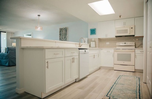 Enjoy a fully equipped kitchen that opens to the dining area with seating for six and additional bar stools for extra guests. The large, comfortable living room offers direct balcony access and panoramic ocean views, making this the perfect spot to relax, unwind, and enjoy your New Smyrna Beach vacation.