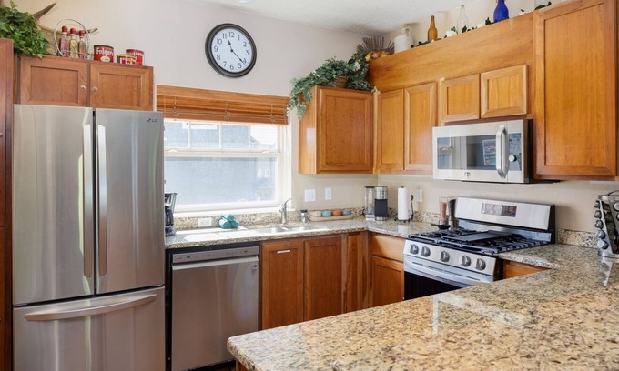 Second Level: Ascend to the second level and be welcomed by an open-concept living area featuring a beautifully decorated dining room. A unique chandelier illuminates the space above a large wood dining table that seats up to six, with additional seating at the breakfast bar, which has three bar stools. The fully equipped kitchen is a culinary delight with granite countertops, stainless steel appliances, a blender, and a toaster oven. Its spacious layout offers plenty of room to prepare your family’s favorite meals.The cozy, rustic living room includes a large sofa, two accent chairs, a gas fireplace, and a flat-screen TV, creating the perfect setting for cozy movie nights. From here, step out onto the private patio where you can enjoy a BBQ with a table and four chairs, all while overlooking the picturesque creek.