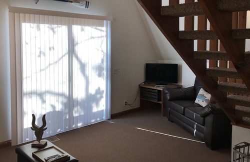 One of our premier Chalets. This unit is a two story floor plan with one bedroom that has a king sized bed, bath, kitchen, dining and living room downstairs and a large loft upstairs with a queen sized bed and a twin. Numerous decks with gorgeous views. We will allow up to 6 guests in this unit. Additional guests more than 4 are $10/night. Children 12 and under stay free.