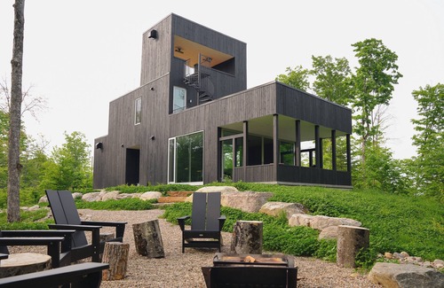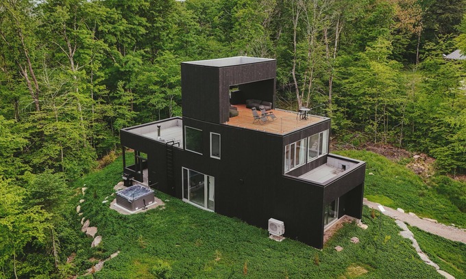 Immerse yourself in the luxury and serenity of our chalet perched on a mountain with panoramic views. Just 10-15 minutes from Tremblant, this modern retreat offers a spa & sauna, 3 King bedrooms, a wood fireplace, a fully equipped kitchen, and terraces.