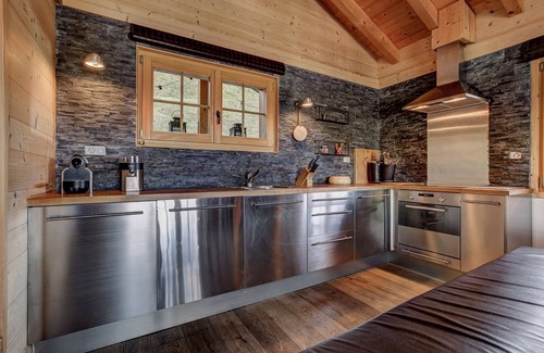 EquipmentThe main floor of this large chalet is an open kitchen/living/dining area with stove fireplace and mountainviews. The kitchen is fully equipped with everything you might need for family catering, including a dishwasher, kettle, toaster, fridge, Nespresso coffee machine, electric filter coffee machine, oven and ceramic hob. There are fondue and raclette sets for a traditional Swiss evening in front of the log fire.A portable outdoor barbecueis available for you to use. The electric heating can be adjusted for your comfort by the thermostats in the livingareas. There is plenty of space in the entrance hall to store all of yourmountain clothes and ski boots, helping you to keep all your snow-sports clothing and equipment dry and organised.There is a utilityroom with washing machine and separate dryer.
