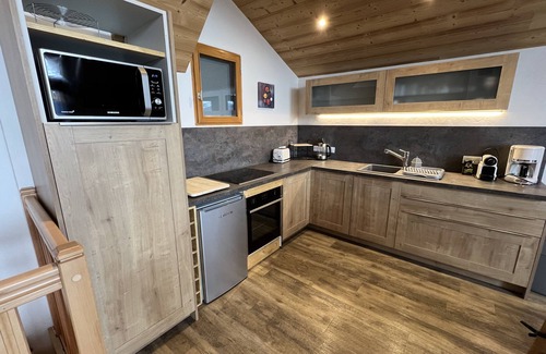 The kitchen with a nice dining area. The kitchen is very well equipped and includes an oven, induction hob, fridge/freezer, washing machine, dryer, dishwasher, microwave, coffee machine and both raclette set. The dining area contains a good sized table with 10 chairs and the large living area contains two sofas (one which converts into a full sized double bed) and additional comfy seats. There is an open fire, a Smart TV connected to a satellite dish and with some english channels. A large living room and an entry porch and double glass doors open onto the full length balcony, which has magnificent views to Mont Blanc.