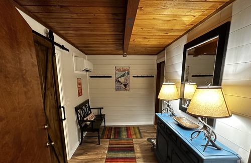 The cabin has a cozy open floor plan with a full kitchen, living, and dining areas on the main level. Primary Bedroom is also on the main which has a queen bed and features a full Bath with soaking tub. The sleeping loft/2nd bedroom which is open to below, features a queen with two twin beds, and a TV area to enjoy movies, Roku streaming device or bring your gaming console.