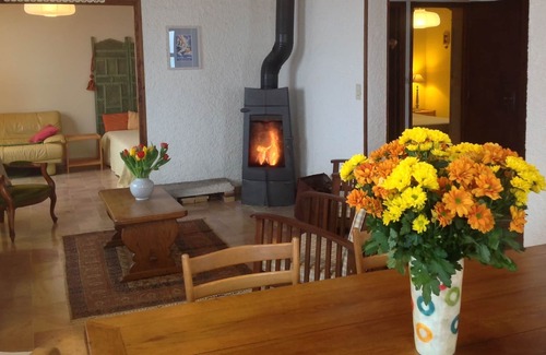 Ground floor: large living room with wood stove, a TV room convertible into a bedroom with sofa bed (good mattress) 160/200, dining room and fitted kitchen area, 1 bedroom with a 160/190 bed. bathroom with WC. Direct access to the terrace and to the grounds.