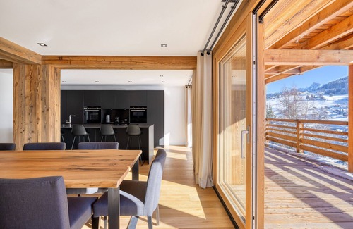 The generous living areas are an ode to comfort and conviviality: a central fireplace for warm winter evenings by the fire, a dining area with family or friends overlooking the mountains and a fully equipped kitchen open to the living room.