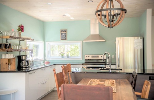 The open concept kitchen at Chalet Freya de Charlevoix has a central island and all the equipment that will allow you to concoct delicious gourmet meals or simply heat up a prepared dish after a busy day of activities.