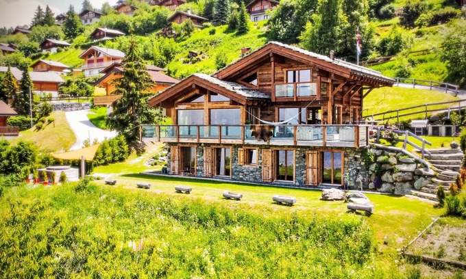 Very beautiful chalet "Alpview VG", 3 storeys, built in 2017. On the outskirts, 1.1 km from the centre, in a quiet position. Private: well-kept garden 1'000 m2 (not fenced). Hot tub. In Winter: please take snow chains, 4x4 car recommended in winter. Parking (for 2 cars). Shop 1 km, restaurant 1 km, bakery 1 km, bus stop "Haute-Nendaz, station/poste" 1.5 km, railway station "Sion" 17.2 km, outdoor swimming pool 700 m. Golf course (18 hole) 15 km, tennis 700 m, skisport facilities 2 km, ski bus stop 600 m, ski-kindergarten 700 m, cross country ski track 5 km, ice rink 1 km, children's playground 850 m. Nearby attractions: Alaïa Bay - Surf Park 16 km. Well-known ski regions can easily be reached: Nendaz Tracouet 4 Vallées 2 km. Hiking paths: Bisse du Milieu 1.5 km. Please note: ski bus (free of charge).