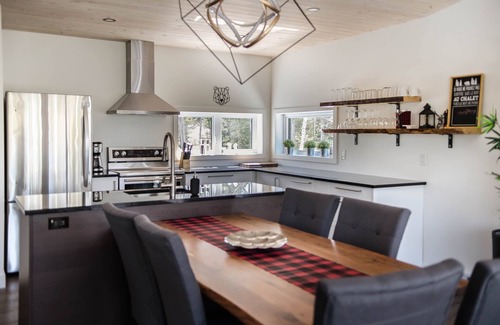 The open concept kitchen at Chalet Freya de Charlevoix has a central island and all the equipment that will allow you to concoct delicious gourmet meals or simply heat up a prepared dish after a busy day of activities.