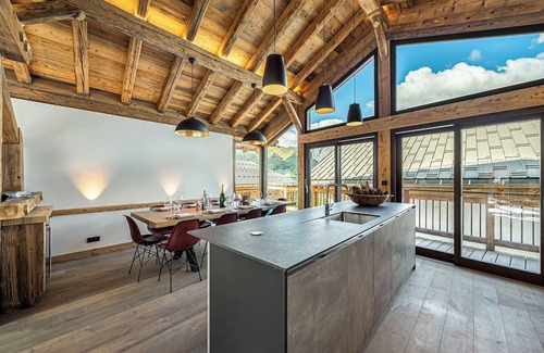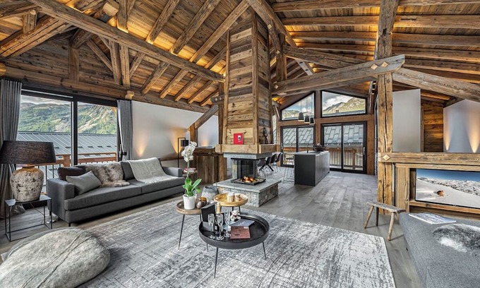 Step inside and you'll find yourself in a world of elegance and comfort. The interior design effortlessly marries traditional Alpine elements with contemporary touches, creating a warm and inviting atmosphere. The perfect place to unwind after a day on the slopes, Chalet Grosjean will have you sinking into plush sofas gathered around the crackling fireplace. Large patio doors and windows flood the room with bright, natural light before leading out onto an external balcony.