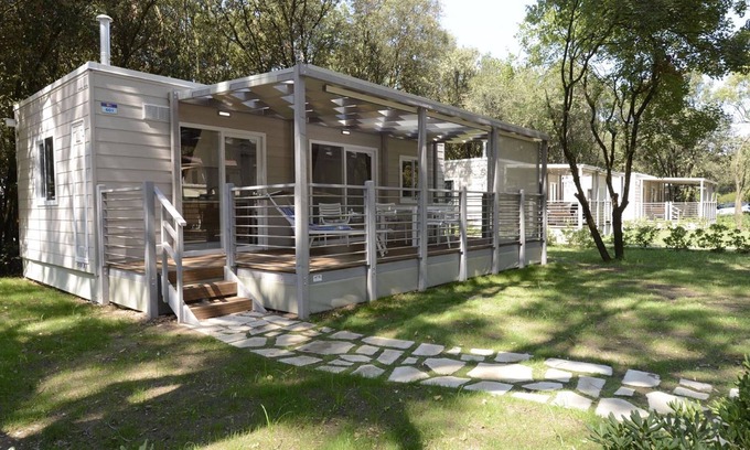 Spacious Comfort in the Pines Set within the lush pine groves of Baia Domizia Camping Village, this modern three-bedroom, two-bathroom chalet is perfect for families or groups up to six. The bright interior includes a fully equipped kitchenette, satellite TV, and air conditioning (available for a fee), ensuring you feel right at home. Step outside to your private veranda with garden furniture and sun loungers—ideal for morning coffees or evening chats under the stars. Private parking adds extra ease to your stay. A Resort That Has It All Whether you're here to unwind or stay active, this holiday village has it all. Lounge by the large swimming pool with panoramic sea views or take a short stroll to the private beach—over 1 km of golden sand just for guests. Children will love the miniclub and dedicated entertainment programs, while adults can enjoy tennis courts, the gym, or live evening shows. With on-site restaurants, bars, and a convenient shopping center, everything you need is within walking distance. Discover Campania’s Treasures This chalet is a perfect base to explore the cultural and natural gems of Campania. Visit the iconic ruins of Pompeii, tour Naples' vibrant streets, or ferry to the enchanting islands of Ischia, Capri, and Ponza. From stunning coastlines to historic marvels, your days can be as relaxing or adventurous as you choose. Please note: pets are not allowed, ensuring a peaceful stay for all guests.