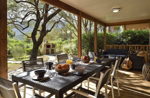 A green oasis just a few meters from the beach! In harmony with the Corsican nature, in a 6-hectare wooded park and a short walk from the beautiful sandy beaches of Portigliolo and the coves of the Belédère nature reserve, U Livanti offers an incomparable location for your holidays. The chalets are comfortably furnished and have a covered terrace and air conditioning. The Frienanlage is located on the Belvédère-Campomoro road in the town of Propriano. In a few minutes you can reach the villages of Propriano, Sartène, Campomoro, Olmeto and Porto-Pollo. Discover the beaches and nature in the area, the wide range of water sports, visit the largest Genoese tower in Corsica in Campomoro or explore the port city of Propriano or the city of Sartène.