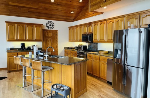Charming, 6 bedrooms, each with bathroom, spacious Cabin with stunning panoramic views of Bell Mountain area and Lake Chatuge. Located in Bell Medows neighborhood minuets from Hiawassee; restaurants, grocery store, brewery, coffee shop and Fresh Market stand. Fairground and lake beaches all around. Mountain biking n hiking 7 min drive distance to Jack Rabbit. 15miles from famous Helen; tubing and zip lines, rollercoaster. Open concept kitchen and living room with gas fire place, TV and deck wrapped all around with Bbq. Main level has 3 bedrooms /3 baths with an open loft./ bathroom with tub. Downstairs; living room with 75” TV and 3 bedrooms/ 3 baths. Kitchen fully equipped w an ice machine, coffee maker, toaster.