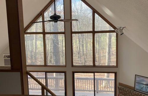 This chalet overlooks the golf course through the trees. This home features a queen bedroom downstairs and a loft king bedroom upstairs. The king bedroom is open, overlooking the gorgeous floor-to-ceiling windows that span both stories. There is a bonus sunroom that receives sunlight all day long with a trundle bed featuring two twin mattresses. Off the bonus room is a screened-in porch with a ceiling fan, perfect for watching the deer and other wildlife with a cup of coffee or a glass of wine.