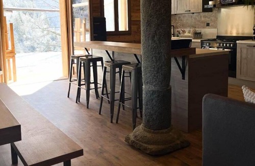 Alpine chalet on 3 levels on the mountainside. Ground floor: 3 bedrooms (1 double bed 160x190 cm / 1 double bed 160x190 cm / 2 single beds 90x190 cm). 1st floor: bathroom with toilet (shower), 1 bedroom (2 single beds 90x190 cm). Level -1: living room-kitchen, separate toilet. Accessible only in summer via a passable mountain road. Electricity supplied by solar panels. Internet connection via Starlink. Comfortable mountain chalet with a generous 140 m² living space for 8 people. The 61 m² living room is spread over several levels and is bright and opens directly onto the exterior. Exposed beams and a stone wall add character to the room. A gas grill is also included.