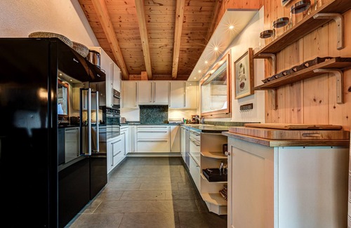 EquipmentThe main floor of the chalet is a large open space with separated zones for the kitchen, living and dining areas. The kitchen is fully equipped with everything you might need for catering for thirteen people, including double oven, induction hob, dishwasher, microwave, kettle, toaster, Nespresso coffee machine, electric filter coffee machine, full size fridge and separate freezer. There are fondue and raclette sets for a traditional Swiss evening in front of the log fire. Washing machine, tumble dryer, hairdryers, iron and portable outdoor gas barbecue are all available for you to use.