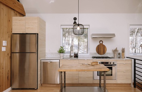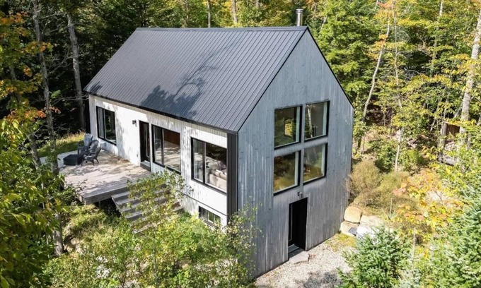 Located an hour outside of Montreal and set on a private 50,000 sq. ft. lot, you'll be surrounded by nature with all the comforts of a boutique mountain retreat. Enjoy indoor and outdoor wood-burning fireplaces, a private spa, and modern design touches throughout.