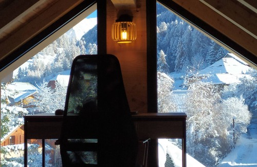 - A l’étage : une chaleureuse pièce à vivre de 50 m² entièrement vitrée surplombée d’une mezzanine mansardée de 10 m², d'une cuisine ouverte de type américaine avec son coin repas et d'un espace salon détente qui offre une magnifique vue dégagée sur les montagnes et la vallée. Cette pièce donne accès à un balcon aménagé avec table extérieure . Sur ce même niveau, deux belles chambres équipées d’un lit double, une salle d’eau avec douche et meuble à double vasques et un WC séparé.