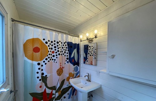 Unwind on our pink porch overlooking the serene Chalet on the Lake community pond at Unit 100. This well-maintained chalet offers comfortable beds, new furniture, and a recently renovated bathroom. The main floor features a spacious common area seamlessly blending the kitchen, dining space, and living room for gatherings. A fully stocked kitchen ensures culinary ease, while the living room provides a perfect spot to relax. Upstairs, two charming bedrooms promise a peaceful night's sleep.