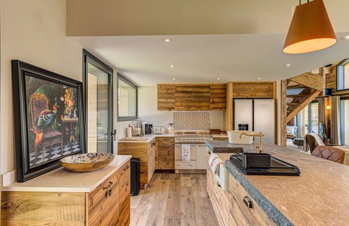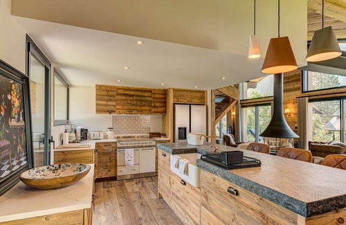 Comprised across three thoughtfully designed floors, this beautifully appointed chalet offers the perfect blend of modern comfort and alpine charm. The upper level features a spacious open-plan living, dining and kitchen area designed to maximise the breathtaking views through expansive windows. The living space is enhanced by large and comfortable sofas, a generous dining table, flat-screen TV and a cosy log-burning stove—perfect for relaxing after a day in the mountains.