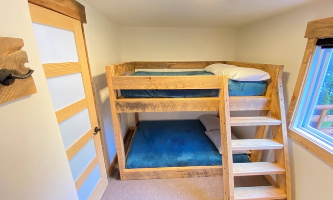 Évadez-vous dans notre charmant chalet de 2 chambres niché au bord d'un lac serein! Profitez de kayaks gratuits et d'un pédalo. Dormez profondément dans un lit queen ou dans des lits superposés confortables. Rassemblez-vous autour du foyer ou dînez dans deux espaces de restauration extérieurs. Une cuisine moderne vous attend à côté d'un salon confortable avec une cheminée. Entouré de sentiers pédestres et de vues imprenables, c'est le refuge idéal pour les amoureux de la nature!