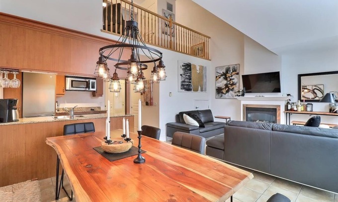 Ce condo sur deux étages avec 3 chambres et deux salles de bains avec une vue dégagée sur les pistes de ski se trouve à 2 minutes à pied du Sommet Saint-Saveur et du Parc F.U.N et à 15 minutes à pied du coeur du centre ville de Saint-Sauveur.