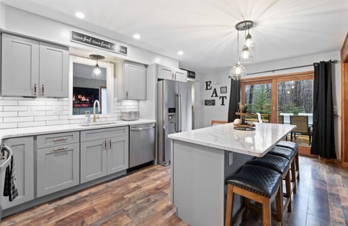 This centrally located, newly renovated chalet is the perfect place for multiple families under one roof and never run out of things to do. Located in the private community of Arrowhead Lake, there`s nothing but empty acreage for miles in the backyard. The indoor entertainment area includes air hockey, shuffleboard, dartboard, Xbox and Nintendo Wii. Relax outside at the massive custom bar with plenty of seating or cozy up by the firepit and play cornhole. Minutes to all Pocono attractions!