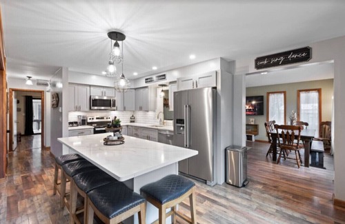 This home features 5 bedrooms with a total of 10 beds, including 2 sofa beds. The first floor offers two living rooms, one with vaulted ceilings and a gas fireplace. Each floor has a full bathroom, with the upstairs bathroom being the only one equipped with a tub. The house is equipped with 7 Smart TVs, all with streaming capabilities—just log in with your own account. Enjoy the fastest available internet speed. The back of the house leads to the entertainment center, which opens up to the backyard bar and firepit. In the front, you`ll find a spacious deck and ample parking.