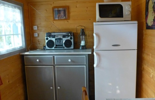 Part kitchen with dining area, 1 buffet, 1 fridge freezer, cooker with oven 1 (4 lights) gas, sink, 1 microwave, 1 electric coffee maker, dishes and utensils.